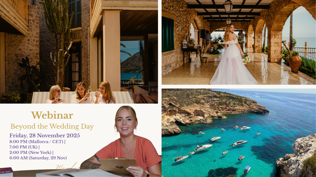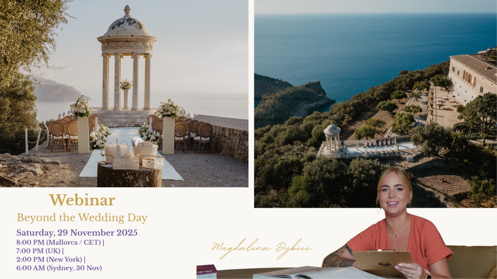 Article based on the live webinar hosted by Magdalena Dybiec SUMMARY Magdalena introduced guests to the world of Mallorca weddings and walked them through every step of the process. The core topic of the webinar was the three-day wedding experience – pre wedding day, the wedding day, and the post wedding celebration. She explained the […]