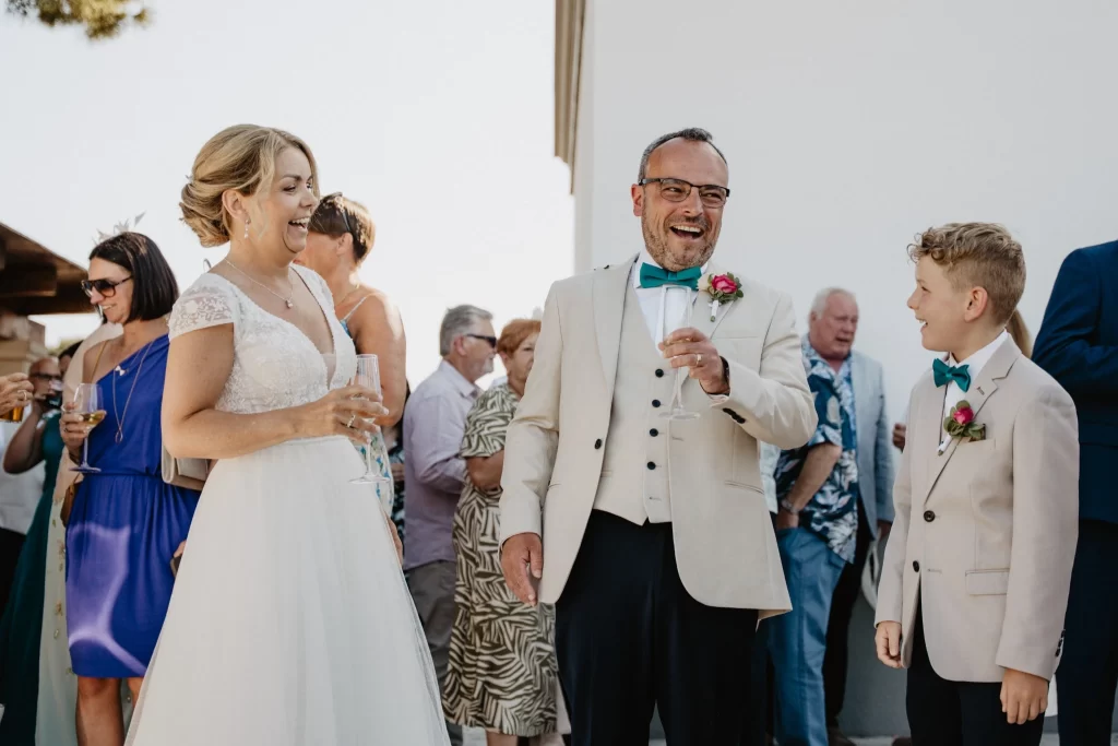 When the ceremony’s emotion softened, there was time for a glass of bubbles and that first unguarded laugh when every muscle lets go. Conversation flowed like warm water. Friends in airy dresses and linen shirts swapped toasts and travel tales, talked children and plans, embraced the afternoon as if it were made especially for them.