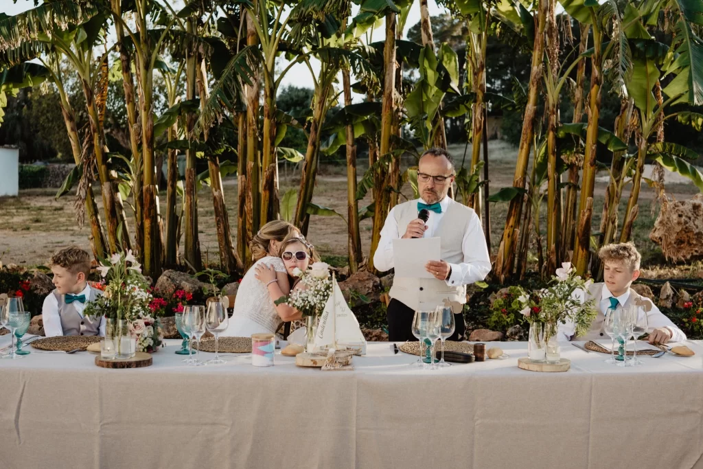 This was never a story about just two people. Their boys have been there since the first chapter – from those August fairy lights to the wedding day. The younger asked to speak during the ceremony and shared a few lines that left a soft imprint on everyone’s memory. Later, when speeches began, the head table sat beneath the banana palms. Hannah leaned into a hug, Gareth read with calm, the boys looked on with pride. The scene said what words rarely can.