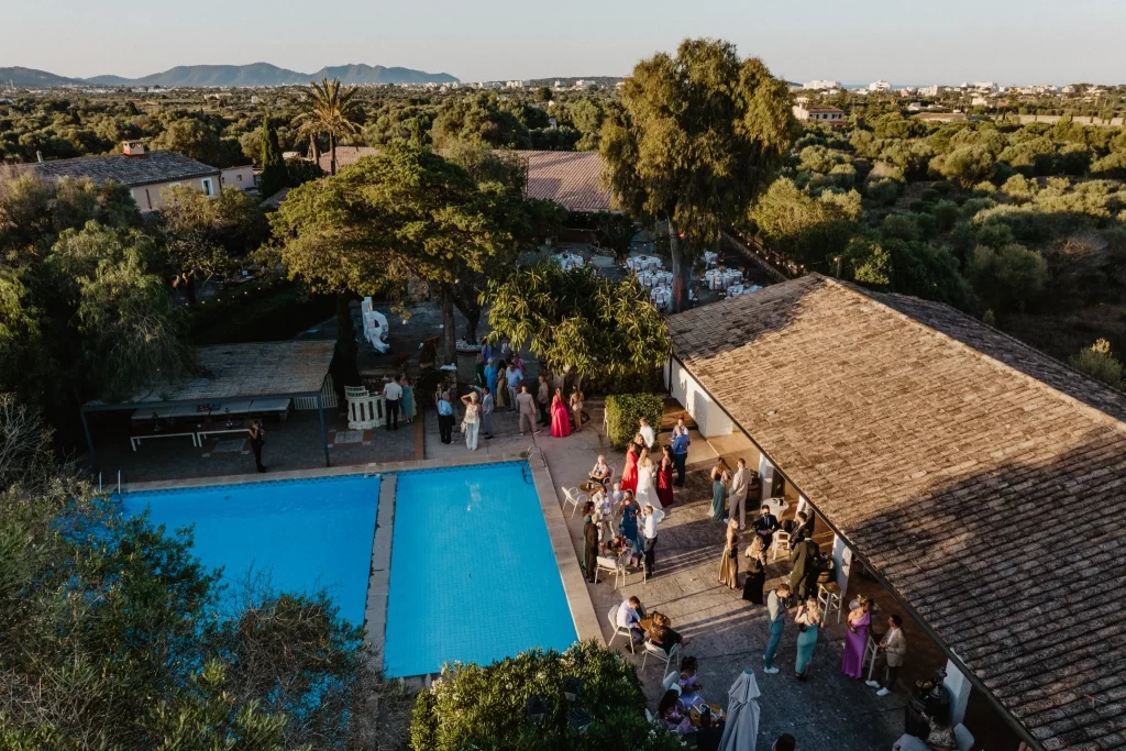 Drone shots read like a map of the whole day. From above you see the celebration’s three acts: the ceremony by the pool, cocktails at the neighbouring patio, and dinner on the large courtyard. Neat rows of white chairs on the lawn, the shaded cocktail space and the circle of dinner tables – everything linked by easy walkways so guests moved naturally and freely. Those images show how thoughtful logistics become invisible: people simply feel that everything is in the right place.