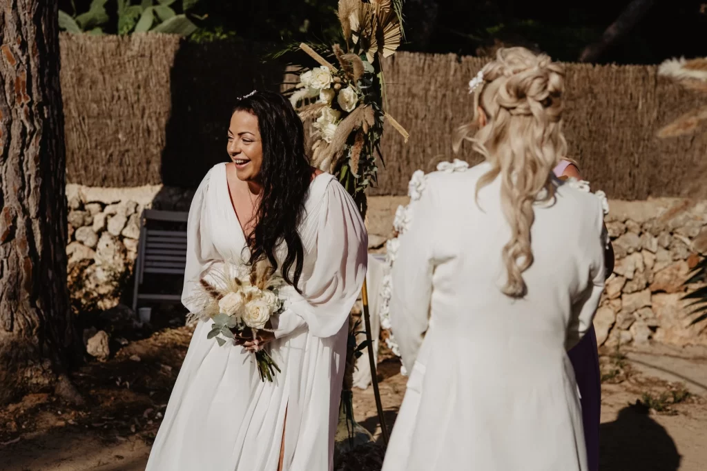One bride is from Bristol, the other from Cornwall. Two beloved places, each with its own pull, made narrowing down a home-ground wedding almost impossible. They also wanted to tilt the odds towards sunshine – to give themselves a real chance at the kind of golden, open-air celebration they pictured. Destination wedding, then. And among the destinations that had captured their hearts, Mallorca was the one they returned to, again and again, from the early days of their relationship. It is a place that feels generous and easy to them – simple, luminous, full of sea-air. When your favourite island is also where you feel most like yourselves, the choice begins to make itself. If you ask them why Mallorca, the answer is tenderly practical: because it is the place that already felt like home