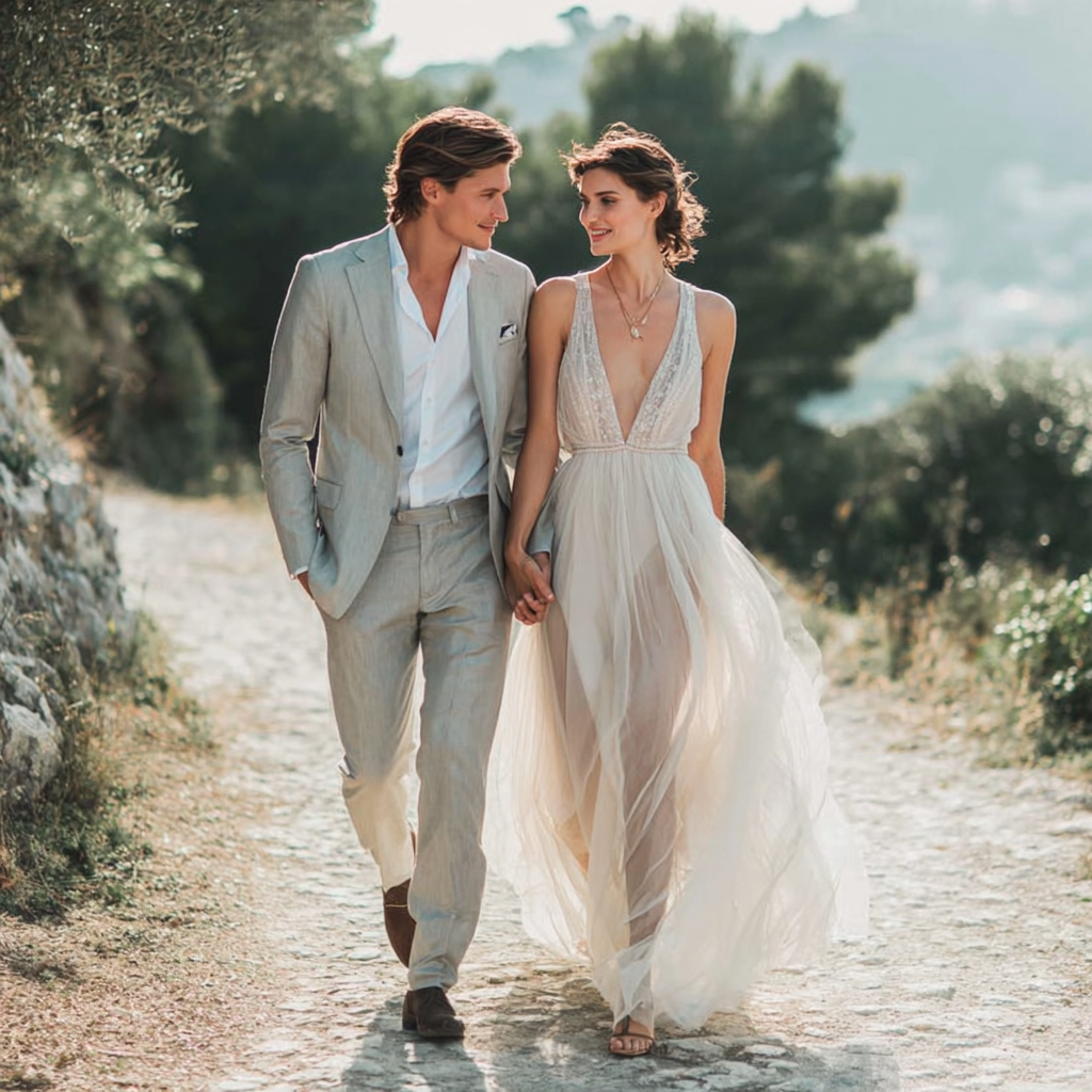 Grooms and wedding parties follow the same philosophy—linen suits, softer fabrics, thoughtful tailoring that suits the Mediterranean climate and the island’s natural elegance.