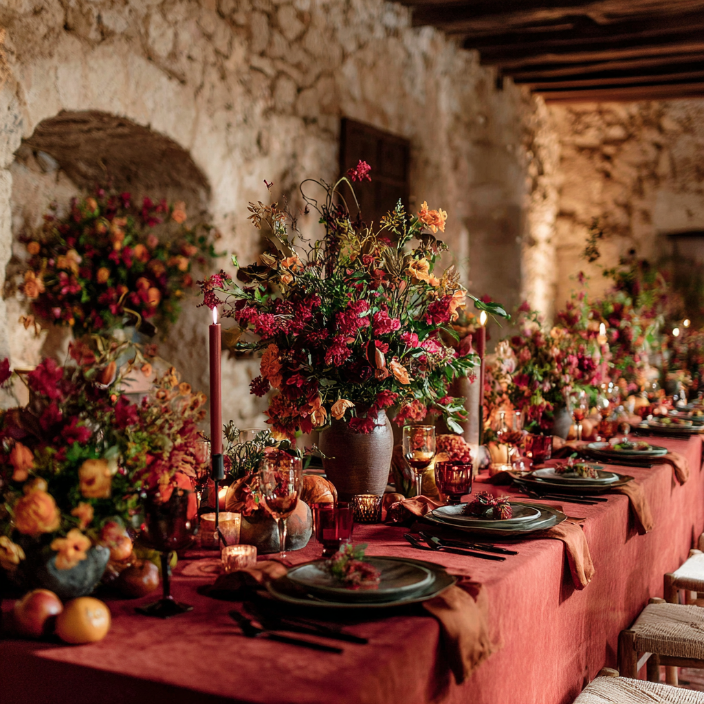 The most popular palettes include fuchsia, burgundy and cherry tones that echo Bougainvillea in bloom. Earthy greens and terracotta reflect the landscape of the Tramuntana. Citrus shades paired with cobalt celebrate seaside venues. Dusty blue with gold accents brings softness and warmth to evening celebrations.