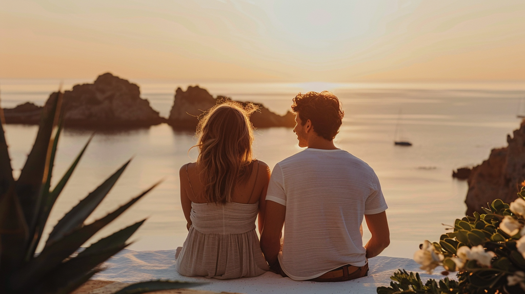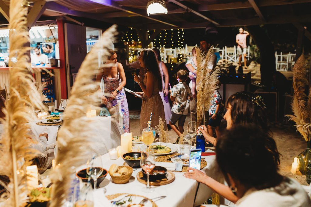 Romantic seaside wedding dinner at dusk with pampas grass décor, candlelight and a couple enjoying an intimate reception by the water in Mallorca.